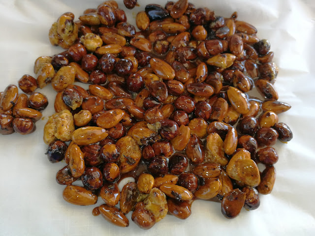 In a saucepan, pour sugar and water and bring to a boil. When bubbles are forming and sugar has fully dissolved, pour hazelnuts and almonds in. The syrup will coat the nuts and form a sugary crust around them.